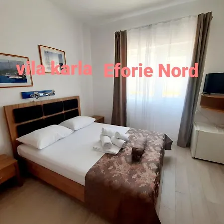Vila Karla Hotel Eforie Nord biedt 12 kamers met een minibar en moderne gemakken zoals een flatscreen TV met satelliet zenders. Ingericht met een bankstel, hebben ze ook geluiddichte ramen.